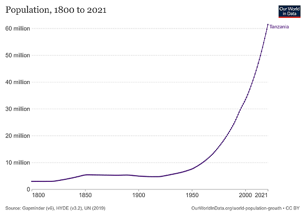 По данным на 2019 год население страны составляет около 60 млн человек. Население размещено довольно неравномерно. Около 80 % жителей страны проживает в сельских районах. Крупнейшим городом Танзании является Дар-эс-Салам, в котором проживает более 4 млн человек. В стране проживает около 120 различных этнических групп, наиболее многочисленные из которых: сукума, ньямвези, джагга, нгонде, мхая, хехе, бена, гого и маконде, курия, чагга, ваха, ниатуру. Большая часть этнических групп принадлежит к группе народов банту, часть относится к нилотам и койсанским народам. Небольшая доля населения Танзании — лица индийского, арабского, европейского, китайского и другого происхождения.