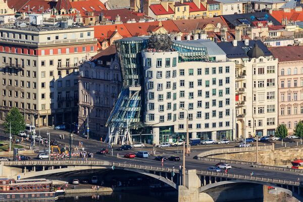 Дом расположен в районе Прага 2, на углу Рессловой улицы и набережной. Авторы проекта — хорватский архитектор Владо Милунич и канадский архитектор Фрэнк Гери. Строительство велось с 1994 по 1996 годы. Строительство дома курировал лично Вацлав Гавел.