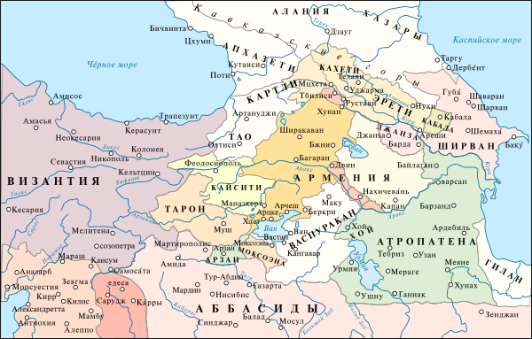 В годы правления Македонской династии и особенно в первой половине X века — Лев VI, Роман Лакапин и Константин VII Багрянородный — византийцы расширялись на восток, подчиняя различных арабских эмиратов. В этих походах византийские императоры просили помощи у иберийцев (грузин), которые, имея славу способных воинов внесли свой вклад в военных походах и занимали соседние крепости[69]. Константин VII Багрянородный в своей работе «Об управлении империей» описывающий стран и народов, граничащих с империей, выделяет Херсонес, княжества Армении и Иберии среди вассалов, ориентирующихся в своей политике на интересы Византии, но абсолютно неподконтрольные во внутренних делах[70]. Отношения с империей не выходили за рамки своеобразного «союза старших и младших царств», что нисколько не мешало грузинским политическим образованиям проводить достаточно независимую политику, которая часто противоречили интересам Византии на Востоке[60].