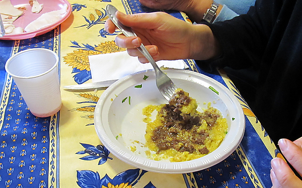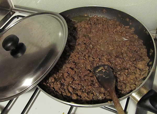 После того, как лук и чеснок обжарятся до золотистого цвета, на сковороду выкладывается рубленая ослятина. Мясо обжаривают, периодически перемешивая, солят и сдабривают его дополнительными специями — обычно чёрным перцем и гвоздикой, иногда кориандром. Часто в фарш на этом этапе добавляют мелко нарубленное лардо — особенно, если лук и чеснок до этого пассеровались без него. Когда мясо потемнеет, в него вливают красное вино, после чего огонь убавляют и тушат образовавшуюся массу до тех пор, пока из неё не выкипит жидкость и она не станет достаточно рассыпчатой[3][9].