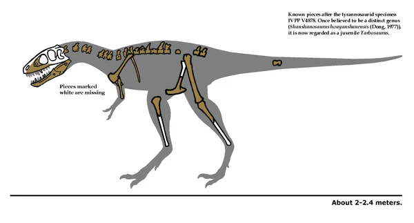 В середине 1960-х годов китайские палеонтологи обнаружили в Синьцзян-Уйгурском автономном районе (формация Субаши) ископаемые остатки (неполный череп и скелет) небольшого теропода, получившего кодовый номер IVPP V4878. В 1977 году китайский палеонтолог Дун Чжимин описал этот экземпляр как представителя нового рода Shanshanosaurus huoyanshanensis[30]. В 1988 году в работе американского исследователя Грегори Пола шаньшанозавр был описан как представитель вида Aublysodon (вид тираннозаврид, позже исключённый из биологической типологии)[20]; впоследствии Дун и Карри, вновь проанализировав ископаемые остатки шаньшанозавра, пришли к выводу, что они принадлежат подростковой особи крупного тираннозаврида, но не сумели определить, какой именно вид они представляют, хотя тарбозавр был указан как один из возможных вариантов[31]; к таким же выводам пришла в 2011 году японско-монгольская исследовательская группа после изучения ископаемых остатков детёныша тарбозавра в возрасте 2—3 лет, имеющих значительное сходство с аналогичными ископаемыми остатками шаньшанозавра[32]. В последующие годы разрозненные ископаемые остатки тираннозаврид были найдены также в других районах КНР, и многим из них местные исследователи дали собственные названия; вместе с тем, ископаемые остатки, описанные как Albertosaurus periculosis, Tyrannosaurus luanchuanensis, Tyrannosaurus turpanensis и Chingkankousaurus fragilis, возможно, принадлежат тарбозаврам[23].