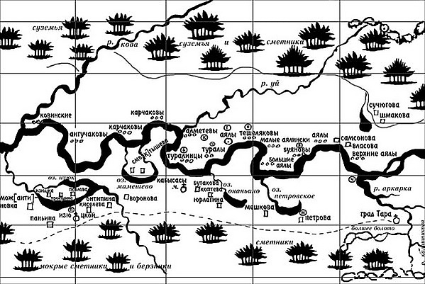 Кроме того 6 человек служилых людей имели займища и 77 человек отъезжие пашни. Во всех этих деревнях и займищах проживало 150 человек в 46 дворах. Пашенными крестьянами основана только одна деревня Чекруш при реке Чекруше. В этой деревне было 4 двора, 2 землянки, 8 человек крестьян, которые имели свои дворы в Таре.[6]