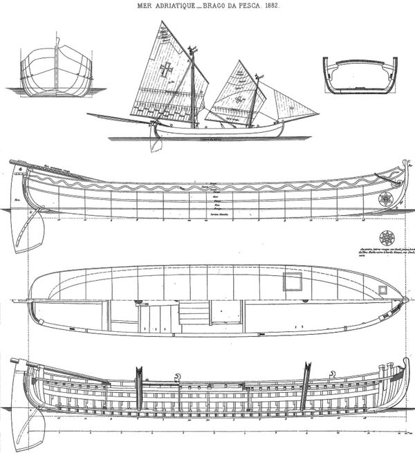 — на первом чертеже Пари приведена одномачтовая тартана, которая, если сравнить с изображениями Жува, практически не изменилась за 200 лет. Два других чертежа подписаны как «Тартана Адриатического моря» и «Рыбацкая лодка Адриатического моря» (Mer Adriatique — Braco de pesca) — оба судна имеют одинаковое парусное вооружение, но тартану от «braco»[прим. 1] отличают гораздо более полные обводы, что характерно для тартан. Приведённое на чертежах парусное вооружение не характерно для тартан — люгерное (рейковое) парусное вооружение определяет скорее требаку или брагоцо (итал. bragozzo), из чего можно сделать вывод, что в разное время и в разных регионах понятие тартана не всегда определялось парусным вооружением. В ходе построения модели по чертежам, размещённым в альбоме адмирала Пари, известный украинский моделист Анахин Виталий Александрович выяснил, что на двух последних чертежах изображена лодка из конкретного региона Италии — провинции Кьеджа. Это тартана Чигиотта. По конструкции она имеет некоторые различия с bragozzo. Если одновременно с изучением альбома Пари, изучать ещё книгу Марио Марзари, посвящённой конструкции bragozzo, можно последовательно выделить все различия в их конструкции.