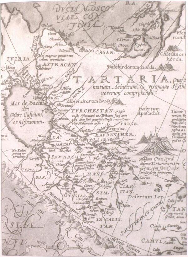 Первые российские картографы, следуя европейской космографии, приняли восходящую к античности границу между Европой и Азией по Танаису (Дону); для русских граница первоначально не имела религиозного смысла средневековой дихотомии между добром и злом. Такой подход имел важные следствия. Хотя Московия западнее Дона находилась в Европе, Российское государство стало почти полностью азиатским[137]. Восприятие европейцами Московии как архаичной страны[К 15], сравнимой с государствами инков, ацтеков, оттоманов или моголов, нашло отражение в европейской иконографии, в которой совмещались образы Московии и Тартарии. Карта Дженкинсона (1562), Атлас Ортелия (1570—1598) и «Новая карта Тартарии» (1626) Джона Спида изображают русского царя, восседающего перед татарской юртой, а тартара — в одежде опричника[138][114]. Двойственное положение России дополнялось тем фактом, что её азиатская часть являлась и востоком, и севером: в европейской картографии Сибирь включалась в «Северную русскую Азию» и, позднее, в русскую или северную Тартарию, которая точно относилась к Востоку[139]. Так, немецкий авантюрист Генрих фон Штаден, посетивший Московию в 1560—70-е годы, в своих записках писал: «На земле московита, идущей не далее Мезени, затем на 1000 миль пути по суше, [живут] нехристианские и дикие народы, от Оби также по реке можно доплыть до Америки и Тартарии»[140]. В этих специфических условиях (между «цивилизованным Западом» и «Азией диких скифов») в XVI веке русские исследователи начали изучать Тартарию, опираясь как на собственный опыт пространственной близости, так и на европейские источники, которые, в свою очередь, часто использовали русские сведения[141].
