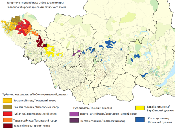 Народно-разговорный татарский язык исследователями делится либо на 3[14][15][16][17][18], либо на 5 основных диалектов[19][20][21]. В последнем случае в языке сибирских татар выделяют три отдельных диалекта татарского языка: тоболо-иртышский, барабинский и томский.