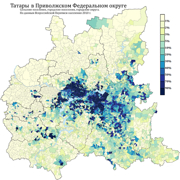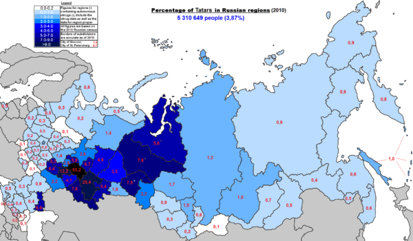Тата́ры (самоназвание — тат. татарлар, tatarlar) — тюркский народ[35] России и постсоветских стран, крупнейшее национальное меньшинство, ареал: Европейская часть России, в основном Поволжье и Приуралье, а также Сибирь, Казахстан, Средняя Азия, СУАР, Крым, Дальний Восток, Финляндия, Литва. Являются вторым по численности народом в Российской Федерации после русских. Делятся на три основные этнотерриториальные группы: волго-уральские, астраханские и сибирские[36][37]. Татары составляют более половины населения Республики Татарстан (53,2 % или более 2 млн чел. по переписи 2010 года) и более четверти населения Республики Башкортостан (25,4 % или более 1 млн чел. по переписи 2010 года).