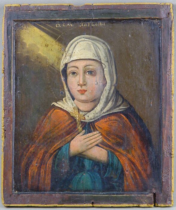 Согласно житию, Татиана родилась в знатной римской семье тайных христиан и была воспитана в благочестии[34]. Она жила на рубеже II—III веков[35]. Достигнув совершеннолетия, Татиана решила не вступать в брак и посвятила свою жизнь служению церкви, став диакониссой. В её обязанности входила забота о больных и бедных, а также подготовка женщин к таинству крещения[36]. Во время гонений на христиан при императоре Александре Севере (222—235) Татиану схватили и пытались заставить поклониться языческим идолам в храме Аполлона. По её молитве, как повествует житие, произошло землетрясение, которое разрушило статую и часть храма. После этого Татиану подвергли жестоким пыткам, но она осталась непоколебима в своей вере. В итоге мученица и её отец были казнены усечением меча[34].