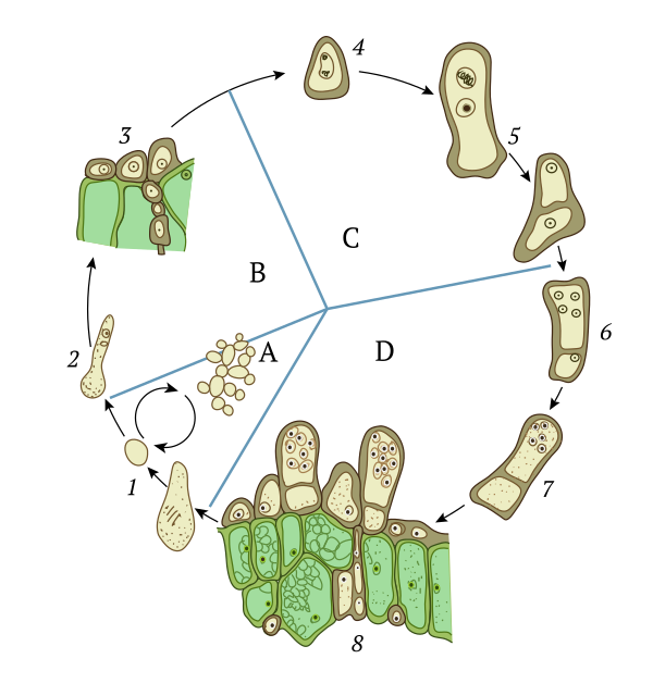 Гаплоидные аскоспоры прорастают бластоспорами, у некоторых видов прорастание аскоспор происходит ещё до освобождения из сумок. Бластоспоры дают начало анаморфной гаплоидной дрожжевой фазе, состоящей из почкующихся клеток, питающихся сапротрофно. Тафриновые дрожжи описывают в составе анаморфного рода Lalaria, введённого в 1990 году[10]. Заканчивается гаплоидная фаза копуляцией (слиянием) клеток и образованием дикариона. У некоторых видов дикариотизация может происходить без спаривания клеток, путём деления ядра. При искусственном разведении дикариотический мицелий обычно не развивается, зато отмечено появление особых толстостенных клеток. Предполагают, что эти клетки способны выживать при неблагоприятных условиях, то есть в природе выполняют функцию хламидоспор. Дикариотический мицелий, в отличие от большинства других аскомицетов (кроме сахаромицетов), питается самостоятельно, а не за счёт гаплоидной фазы. Дикариофаза ведёт исключительно паразитический (биотрофный) образ жизни, развиваясь между клетками заражённого растения[11].