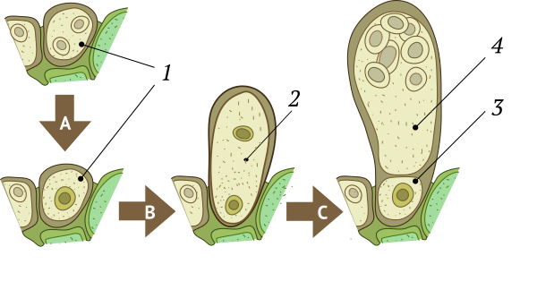 Для рода характерен специфический способ формирования сумок, названный Taphrina-типом. Под кутикулой растения образуется слой клеток, называемых аскогенными клетками, которые представляют собой фрагменты недифференцированных гиф. В них происходит слияние ядер (кариогамия), диплоидные клетки увеличиваются в размерах и их ядра делятся митозом. Одновременно с митозом аскогенная клетка дифференцируется на базальную и предасковую (проаск) клетки, каждая из них получает одно дочернее диплоидное ядро. Затем в предасковой клетке осуществляется мейоз, и формируется короткая 8- или 4-споровая сумка[12], после спорообразования базальная клетка дегенерирует[11].