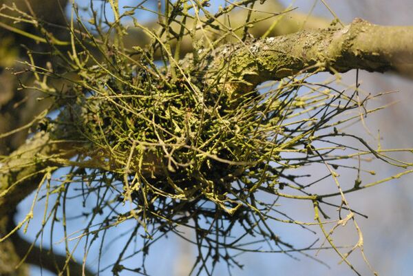 При заражении побегов гриб может стимулировать рост пазушных почек боковых побегов, что приводит к появлению «ведьминых мётел», иногда достигающих диаметра 3 метра. «Ведьмины мётлы» состоят из густых скоплений коротких и утончённых побегов, часто сильно разветвлённых. Такие побеги почти никогда не плодоносят, листья на них мелкие, неправильной формы, быстро опадающие[19].