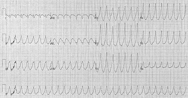 - Зубец Р не определяется в условиях изменённого QRS, только иногда перед деформированным комплексом QRS можно увидеть зубец Р. В отличие от суправентрикулярной формы желудочковая пароксизмальная тахикардия всегда приводит к сердечной недостаточности, даёт картину коллапса и может закончиться смертью больного. Тяжесть желудочковой формы обусловлена тем, что: желудочковая пароксизмальная тахикардия — результат тяжёлых поражений миокарда; она приводит к нарушению синхронного сокращения предсердий и желудочков. Уменьшен сердечный выброс: иногда желудочки и предсердия могут сокращаться одновременно.