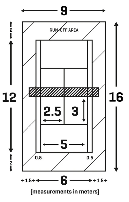 Пропорция корта соответствует таковой в большом теннисе, однако его длина и ширина уменьшены приблизительно вдвое. Таким образом размеры игрового поля составляют 12×6 м, при этом ширина каждого коридора (считаются частью площадки при парной игре) составляет 50 сантиметров; полный размер корта с забегами — 16×9 м. Квадраты, предназначенные для подачи, ограничены 3 м. в длину и 2,5 м. в ширину[9]. Высота сетки — 85 см, что ниже стандартной теннисной на сетки на 6,5 см[8]. Важном отметить, что уровень сетки в тач-теннисе не изменяется от края площадки до её середины — в отличие от большого тенниса, где высота сетки у крепежных столбов составляет 107 см, а к середине корта снижается до 91,4 см.