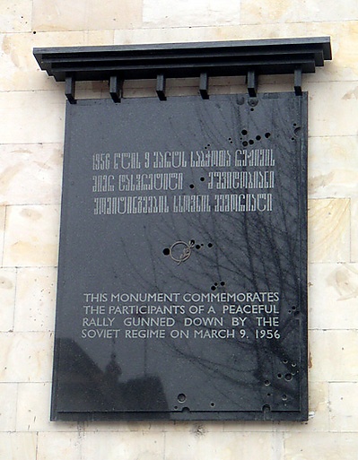 По некоторому мнению, развязанная Хрущёвым антисталинская кампания начала перерастать в антигрузинскую, в частности, в связи с тем, что Хрущёвым «делался откровенный акцент на его (Сталина) грузинское происхождение»[7], что и спровоцировало митинги, начавшиеся в Тбилиси и Гори 6 марта 1956 года «по случаю годовщины смерти вождя и переросшие в акцию протеста против подобных выступлений властей. Участниками этих волнений стала молодёжь, считавшая, что заслуги Сталина перед страной несправедливо занижаются. 9 марта против митингующих в Тбилиси была применена сила, около 150 человек погибли. По свидетельствам участников тех трагических событий на проспекте Руставели (они и по сей день, каждый год 9 марта собираются вместе, чтобы почтить память погибших) далеко не все принявшие участие в митинге были настроены на защиту Сталина. Большая часть митингующих лишь требовала не приплетать ко всем его злодеяниям грузинское происхождение»[7].