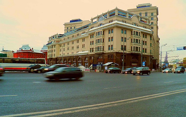 Для одной из первых пролетарских гостиниц был отведён участок в центре Москвы, ограниченный Охотным Рядом, Тверской улицей, площадями Революции и Свердлова[39]. В последнюю очередь предполагалось снести здание гостиницы «Континенталь» и кинотеатра «Востоккино» по площади Свердлова[40]. В 1931 году состоялся открытый конкурс проектов, который, однако, не принёс существенных результатов[41]. Поэтому был назначен закрытый конкурс. Участники конкурса Б. Таут, А. А. Кеслер и И. З. Ванштейн исходили из необходимости сохранения сложившегося ансамбля площади с Большим театром как доминантой, однако это было сочтено явным недостатком проекта, поскольку предполагалось, что новой доминантой должна стать гостиница, которая также открывала проектируемую аллею Ильича, ведущую к Дворцу Советов[42]. Согласно проекту Л. И. Савельева и О. А. Стапрана, на площадь выходил десятиэтажный корпус с полукруглым выступом в северной части для трибуны в виде портика с колоннадой. Также там предлагалось сделать мюзик-холл на 2000 мест. Этот проект и был выбран для реализации, однако мюзик-холл и трибуна так и не были построены, поскольку разрушали ансамбль площади[43].