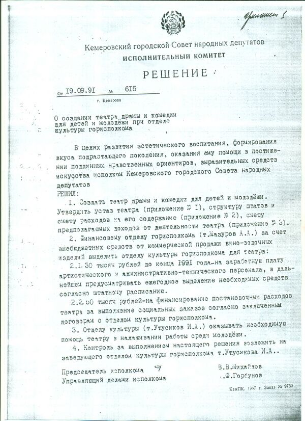 В скором времени студия получила статус театра: 19 сентября 1991 года Председатель исполкома города Кемерово Михайлов В. В. подписал решение «О создании театра драмы и комедии для детей и молодёжи при отделе культуры горисполкома». Театру выделили помещение в бывшем здании Горкома ВЛКСМ (на первом этаже жилого дома по ул. Весенней, 6). Здесь была расположена сцена со зрительным залом на 64 места, зал для репетиций и производственные помещения (цеха и др.). С этого момента театр стал носить название «Театр драмы и комедии для детей и молодёжи на Весенней». Сергей Внуков возглавил театр в качестве художественного руководителя и режиссёра-постановщика, Татьяна Внукова — взяла на себя обязанности директора, труппа театра формировалась из воспитанников студии, а также студентов театральных вузов и училищ. В это время ставились такие спектакли, как «Двенадцатая ночь» (У. Шекспир), «Романтики» (Э. Ростан), «Квадратура круга» (В. Катаев), «Семейный портрет с посторонним» (С. Лобозёров), «Старший сын» (А. Вампилов) и др. Театр гастролировал по Кемеровской области, также выезжал на гастроли в Белоруссию.