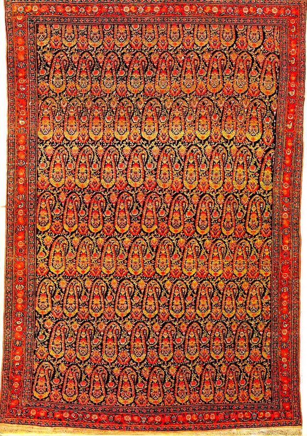 Технические характеристики: плетение тщательно проработано и сверхтонкое, основание старых ковров шерстяное, в современных коврах преобладает хлопок и шелк, узел симметричный, челнок двойной нитью на основе техники лулбаф, борты округленные, как правило имеют большой или средний формат, часто квадратной формы.