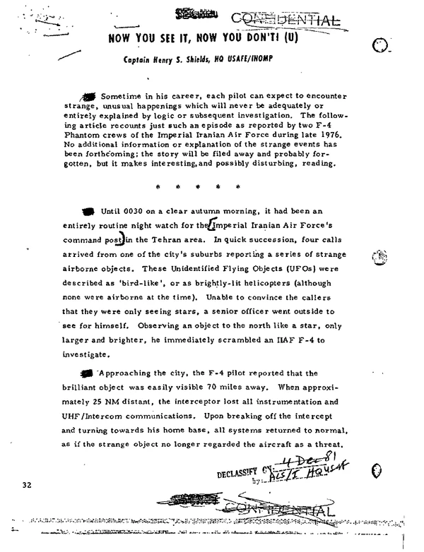 Иногда в своей карьере каждый пилот может встретиться с чем-то необычным, что не может быть полностью объяснено логикой или последующим расследованием. Эта статья рассказывает о таком эпизоде, о котором поведали экипажи двух F-4 Phantom Имперских Военно-воздушных Сил Ирана в конце 1976. Не ожидается никакого объяснения или дополнительной информации: историю унесёт ветром и о ней, наверно, забудут, но это будет интересное и, возможно, волнующее чтение.