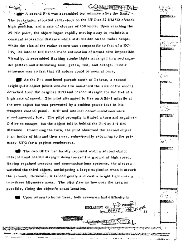 Слышно, что Джафари приказали вернуться на базу, если он не сможет догнать объект, и он прервал погоню. Когда он возвращался, он сказал диспетчерам, что НЛО развернулось и догоняет своих преследователей, и он, возможно, будет вынужден сесть. «Что-то догоняло меня сзади… Я думаю, оно хотело в меня врезаться. Пролетело прямо подо мной, едва меня не коснувшись…» Обеспокоенный голос пилота был явственно слышен на кассете[8]. В статье также говорилось, что пилот говорил о «ярком круглом объекте 4,5 метров в окружности, отделившимся от НЛО». Также сказано, что подлинность объекта подтверждена двумя пилотами F-4, несколькими диспетчерами и свидетелями, которые с земли наблюдали «яркое тело», то ли летящее по небу, то ли падающее с неба.
