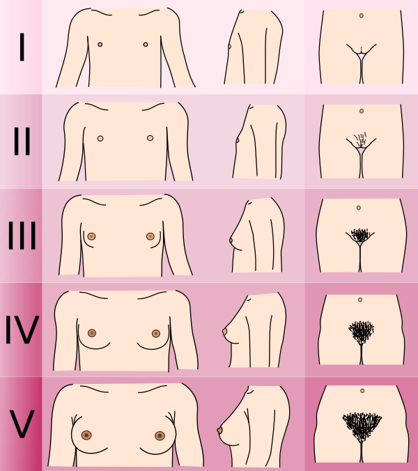 Телархе обычно происходит за два года до менархе — первого менструального кровотечения.