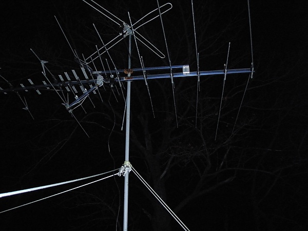 Иногда требуется принимать сигналы от передатчиков, расположенных в разных направлениях. Это можно реализовать для одной станции за раз с помощью поворотного устройства, управляемого электродвигателем. Можно использовать две или более антенн, каждая из которых направлена на нужный передатчик и соединена соответствующей схемой. Чтобы антенны не мешали друг другу, вертикальное расстояние между штангами должно быть не менее половины длины волны самой низкой частоты (Расстояние = λ2)[20]. Важно, чтобы кабели, соединяющие антенны с делителем/сумматором, были точно одинаковой длины, чтобы избежать фазовых проблем, вызывающих призраки в аналоговом приёме. То есть обе антенны могут принимать одну и ту же станцию; сигнал от антенны с более коротким кабелем поступит к приёмнику чуть раньше, что даст два слегка смещённых изображения. Фазовые проблемы возможны даже при одинаковой длине кабеля. Полосовой фильтр или ловушки сигнала могут помочь уменьшить эту проблему.