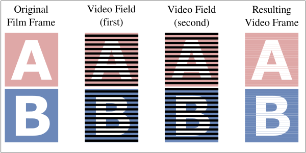 Порогом заметности мерцаний считается частота в 48-50 Герц, поэтому при кадровой частоте в 25 кадров в секунду изображение заметно мерцает, а передача 50 полных кадров требует вдвое большей полосы пропускания при передаче. Поэтому при разработке телевизионных систем применена чересстрочная развёртка. Каждый кадр изображения формируется за два последовательных прохода луча кинескопа — вначале рисуются нечётные строки (1, 3, 5 … 625), затем - чётные (2, 4, 6 … 624). Каждый такой проход занимает 1/50 секунды при европейском стандарте разложения 625/50 и 1/60 секунды для американского 525/60. Разная частота полей была принята из-за привязки к частоте переменного тока, составляющей 50 Гц в Европе и 60 Гц - в Америке. Синхронизация с частотой сети позволяла снизить заметность помех от переменного тока в условиях несовершенства техники. Такие помехи следуют с частотой, равной разности частоты сети и частоты полей.