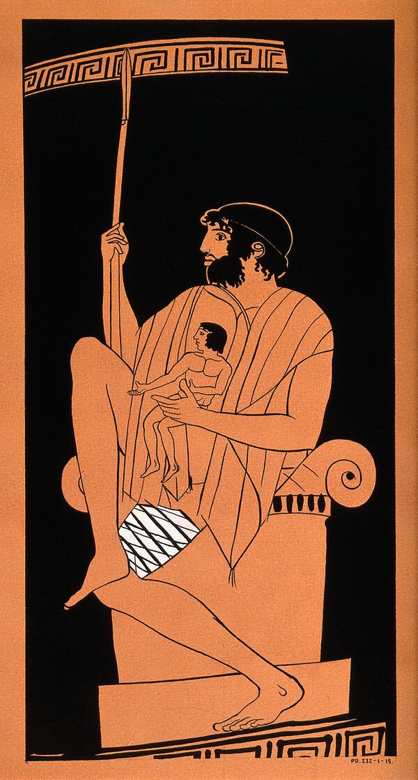 Из боязни перед своим отцом Авга прячет своего сына в святилище девственной богини Афины, которая за это наказывает страну чумой. Телефа выкидывают на дороге в Аргос, на склоне горы Парфения; здесь его кормит рогатая лань, посвящённая Артемиде[7],
