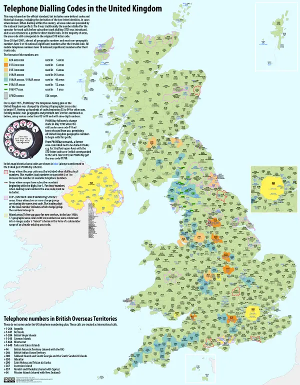 С 28 апреля 2001 почти все географические номера и большинство негеографических номеров имеют длину 9 или 10 цифр после префикса "0". Все мобильные телефонные номера имеют длину 10 цифр, не считая префикса 0. Распределение кодов в британском плане нумерации следующее:[1]