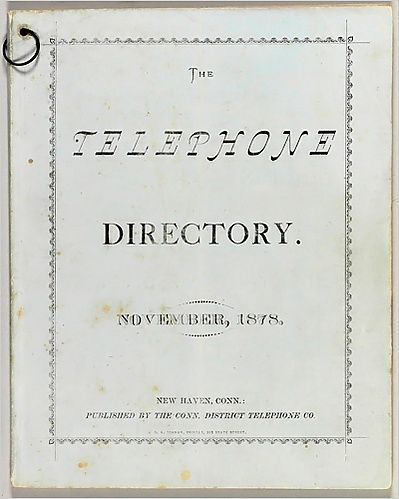 Первый телефонный справочник, состоящий из цельного куска картона, был выпущен 21 февраля 1878 г.; в нем было указано 50 частных лиц, предприятий и других офисов в Нью-Хейвене, у которых были телефоны. [6] Справочник не был отсортирован по алфавиту, и никакие номера не были связаны с включенными в него людьми[7]. В 1879 году доктор Мозес Грили Паркер предложил изменить формат телефонного справочника, чтобы абоненты отображались в алфавитном порядке, а каждый телефон обозначался номером. Доктор Паркер пришел к этой идее из страха, что четыре оператора из Лоуэлла, штат Массачусетс, заразятся корью и не смогут соединить телефонных абонентов друг с другом.[7].