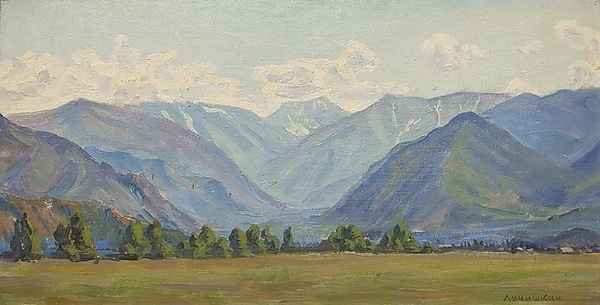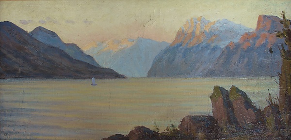 Картина представляет собой летний пейзаж, выполненный в тёплой цветовой гамме. На переднем плане изображена гладь озера, справа — часть каменистого берега коричневого цвета. На поверхности воды находится небольшая парусная лодка. Вдали виднеются горы, вершины которых освещены вечерним солнцем, в то время как левая часть гор остаётся в тени, что подчёркивает использование светотени в композиции.