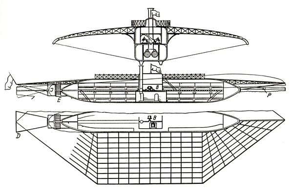 Самолёт «Система воздухоплавания» предназначался, по замыслу автора, для перевозки 120 пассажиров с багажом. Кроме пассажиров на борту должно было находиться запас угля и воды для паровых машин на 10 часов полёта[7]. Согласно проекту, самолёт представлял собой цельнометаллический моноплан с верхнерасположенным крылом исключительно малого удлинения и продолговатым фюзеляжем обтекаемой формы с прямоугольным поперечным сечением, внутри которого были предусмотрены две пассажирские палубы. Крыло имело тонкий слабоизогнутый профиль, заострённый с обоих концов, контуры которого образовывались двойной матерчатой обшивкой. Нагрузки, действующие на крыло, должны были восприниматься как системой расчалок, так и внутренними силовыми элементами крыла, имеющими ферменную конструкцию. Управление аппаратом должно было осуществляться с помощью рулей высоты и направления, расположенных в струе толкающего воздушного винта. Также была предусмотрена возможность управления положением центра тяжести самолёта посредством перемещения специального груза вдоль бушприта на носовой оконечности фюзеляжа. Воздушный винт, располагавшийся на хвостовой оконечности фюзеляжа, приводился во вращение паровой машиной, помещённой в середине фюзеляжа, посредством длинного вала. Для разбега при взлёте предусматривалось применение отделяемого шасси-тележки.