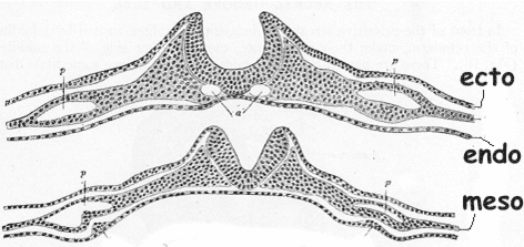 Из эктодермы в дальнейшем образуются нервная система, эпидермис кожи и её производные, эпителиальная выстилка ротовой полости, анального отдела прямой кишки, влагалища. Мезодерма даёт начало внутренним органам (кроме производных эндодермы), сердечно-сосудистой системе, органам опорно-двигательного аппарата (костям, суставам, мышцам), собственно коже.