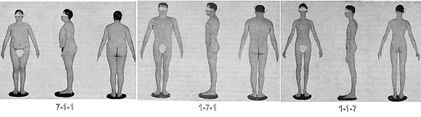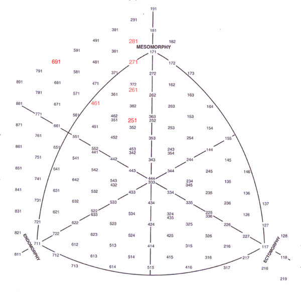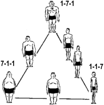 - Чистый эндоморф (Endo — Внутренний, Morph — Форма) (7-1-1) характеризуется шарообразными формами. У такого индивидуума круглая голова, большой живот, слабые, вялые руки и ноги, с большим количеством жира на плечах и бёдрах, но тонкие запястья и лодыжки. Этому человеку, в большей степени, сопутствует избыточное жироотложение.