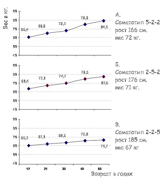 Студент А. Имеет соматотип 5-2-2 и вес 72 кг. При росте 166 см. Это преимущественный эндоморф. Если мы, на основании данных таблиц Шелдона, построим график зависимости гипотетического веса тела для данного соматотипа в разные периоды его жизни, то увидим, что его реальный вес превышает расчётный и будет вероятно увеличиваться с возрастом до 84 кг к 60 годам. Студент Б. — преимущественный мезоморф и его прогнозируемый вес вероятно будет составлять в старшей возрастной группе 83 кг. Иное дело, студент В., при росте 185 см он весит 67 кг. Это нормальный вес для его конституционного типа и мы видим, что с возрастом его вес мало изменится. Таким образом, при определении соматотипа, необходимо учитывать возраст, наличие или отсутствие патологических процессов и степень физической нагрузки, то есть необходимо иметь определённый опыт, позволяющий увидеть «тощего эндоморфа» или «толстого мезоморфа». В практике соматотипирования считается, что для окончательной оценки следует принимать тот соматотип, который складывается к 20-25 годам при нормальном питании. Концепция неизменных соматотипов Шелдона была удобна и для теоретической антропометрии, и для исследования природных типов телосложения. Однако бурное развитие культуризма в 60-е годы привело к появлению таких мышечно-развитых тел, параметры которых не лезли ни в какие рамки. Разработанная в культуризме система тренировок и появление специальных продуктов питания (белки, энергетики, свободные аминокислоты) фактически позволили менять соматотип и поддерживать его в изменённом виде сколь угодно долго.