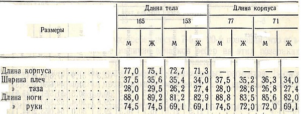 Если же рассматривать пропорции тела у мужчин, не отличающихся в среднем по своему росту от женщин, то результаты будут иными, а именно: такие мужчины, в среднем, будут непременно более длинноногими (по индексу), чем остальные мужчины. Эта длинноногость следствие того, что корреляция длины ног и длины корпуса невелика и поэтому среди отобранных мужчин с малым корпусом будут субъекты как с короткими, так и с длинными ногами. Исследования показали, что женщины по относительной длине ног отличаются как от мужчин малого роста, так и от мужчин с малым корпусом. Женщина более длиннонога, чем первые, и более коротконога, чем вторые. Аналогичные результаты получаются в случае приведения размеров у женщин к длине тела и длине корпуса мужчин (табл 2). При всех расчётах мужчины обладают относительно более узким тазом и более широкими плечами, чем женщины.