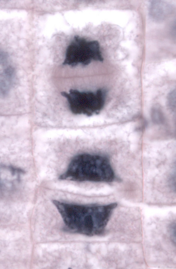 В финальной стадии митоза — телофазе — вокруг двух дочерних наборов хромосом, разошедшихся к противоположным полюсам клетки в стадии анафазы, начинает формироваться ядерная оболочка. Поначалу хромосомы сохраняют свою анафазную ориентацию: центромеры обращены к полюсам клетки, а теломеры — к центру веретена. Образованию ядерной оболочки предшествует разборка веретена деления. Происходит удлинение астральных микротрубочек, и формируется новая структура, состоящая из микротрубочек, — остаточное тельце, которое располагается между двумя обособленными наборами хромосом[2]. Деполимеризация протекает в направлении от полюсов деления к экваториальной плоскости клетки, от минус-концов к плюс-концам. При этом дольше всего сохраняются микротрубочки в остаточном тельце[3]. При сборке ядерной оболочки мембранные пузырьки цитоплазмы связываются с поверхностью отдельных хромосом, потом сливаются друг с другом и окружают группы хромосом, и затем, наконец, сливаются с образованием ядерной оболочки. Раньше всего ядерная оболочка образуется на боковых поверхностях хромосом и позже всего — на центромерах и теломерах. Далее в неё встраиваются ядерные поровые комплексы, формируется ядерная ламина, появляется ядрышко, и оболочка ядра вновь соединяется с эндоплазматическим ретикулумом. Ядерные поровые комплексы загружают в ядро из цитоплазмы ядерные белки, ядро расширяется и хромосомы деконденсируются, переходя в интерфазное состояние, начинается транскрипция генов. Митоз завершается при образовании дочерних ядер, и цитоплазме клетки только остаётся разделиться надвое[4][5].