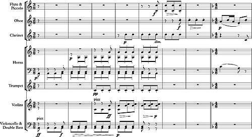 - «семитактовое звено к трио, представляющее собой диминуэндо повторяющихся ля... теперь поднимающихся в последовательности наложенных октав, которые, кроме того, чередуются с до, добавленными к ля. Затем нижние октавы исчезают, и остаются только до, чтобы соединиться с первой фразой гобоя в трио».