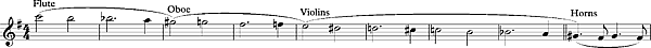 В этих тактах Малер передаёт повторяющиеся ноты через гамму инструментальных красок, смешанных и сольных: начиная с валторн и пиццикато струнных, переходя к трубе, кларнету, флейте, пикколо и, наконец, гобою: