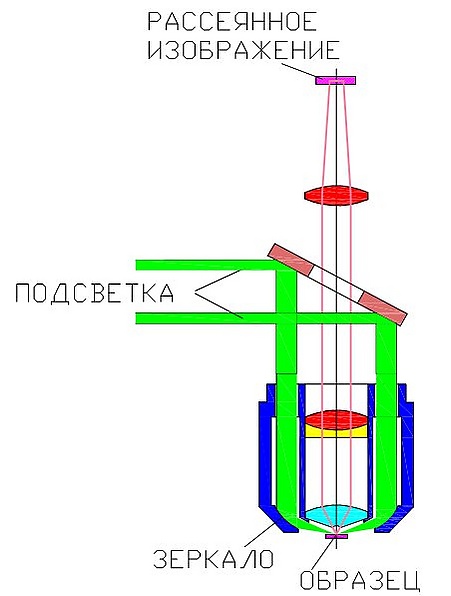 Особенностью микроскопа темного поля является способ освещения образца, который осуществляется «сбоку» (зеленая полоса на рисунке). При таком освещении неоднородности, имеющиеся в образце, рассеивают падающий свет и в микроскопе изображение образца наблюдают в рассеянном свете, а «освещающий» световой пучок не попадает в объектив. Такое освещение называется эпи-подсветкой (EPI-illuminator, EPI—microscope, EPI-objective lens).