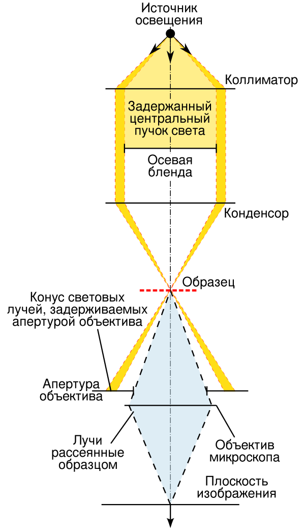 При работе по методу темного поля, препарат освещается полым световым конусом, апертура которого больше, чем апертура объектива, таким образом, входной зрачок микрообъектива оказывается в области геометрической тени и прошедший без преломления свет не попадает в объектив. В оптической микроскопии тёмного поля неоднородности образца рассеивают свет, и этот рассеянный свет формирует изображение исследуемого образца.