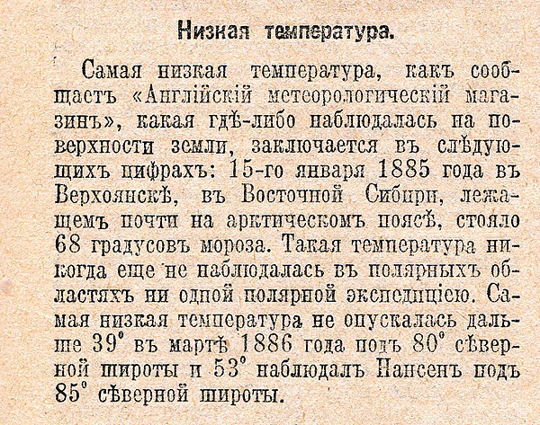 - Рекордно низкая температура на поверхности Земли −89,2 °С была зарегистрирована на советской внутриконтинентальной научной станции Восток, Антарктида (высота 3488 м над уровнем моря) 21 июля 1983 года[60][61]. В июне 2018 года появилась информация о температуре −98 °С, зарегистрированной в Антарктиде[62].
