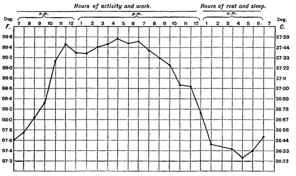 Известны физиологические колебания температуры тела в течение суток — суточный ритм: разница между ранне-утренней и вечерней температурой достигает 0,5—1,0 °C.
