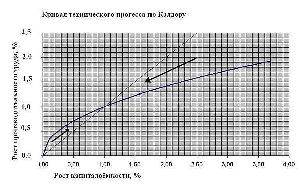 Последнее, правда можно было бы рассматривать как некое произвольное допущение. Но если верно то, что возрастание ТСК приводит к ещё большему увеличению производительности труда, то для предприятий не существует никаких границ. Можно ставить вопрос только о внешних ограничителях, например то, что в соответствии с какими-то техническими причинами ТСК не может произвольно быстро расти. Когда Николас Калдор (см. выше кривую технического прогресса по Калдору) постулирует постепенно ослабевающее действие высокого прироста ТСК, то это действительно можно рассматривать как произвольное допущение, необходимое для того, чтобы представить стабильный экономический рост. Поэтому буржуазные экономисты и исходят из допущения «хорошего поведения» кривой технического прогресса ввиду желательности соответствия их теорий устойчивому равновесному развитию.