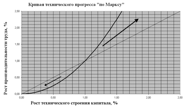 Этот сценарий можно представить, как «кривую технического прогресса». Увеличение ТСК приводит к непропорциональному увеличению производительности труда, как это показано на рисунке, который исходит из предположения, что эта закономерность начинает проявляться при росте ТСК более 1 %. Если же это выгодно для капиталиста, то он будет всю свою прибыль инвестировать в повышение ТСК, а не в создание дополнительных рабочих мест.
