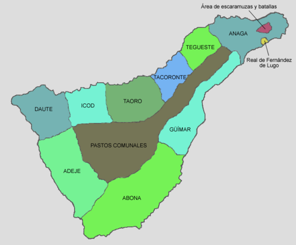 В декабре 1493 года испанский конкистадор Алонсо де Луго получил от католических королей подтверждение своего права на завоевание острова Тенерифе (к тому времени большая часть Канарских островов уже была завоёвана). Выступив из Гран-Канарии, в апреле 1494 года завоеватель высадился на побережье современного Санта-Крус-де-Тенерифе вместе с 2000 пехотинцами и 200 всадниками. После постройки небольшой крепости он начал продвигаться вглубь острова[19].