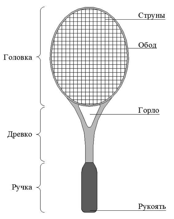 Удары по мячу игрок наносит специальным инструментом — ракеткой, которую можно мысленно разделить на ручку, предназначенную для хвата рукой, головку, которой собственно и отражается мяч, и древко, соединяющее две основные части. Головка ракетки имеет эллипсовидную форму, её внутренняя часть состоит из натянутых поперёк друг друга струн (именно на струнной поверхности сосредоточена основная мощность при ударе), а ограничивается ободом[17].