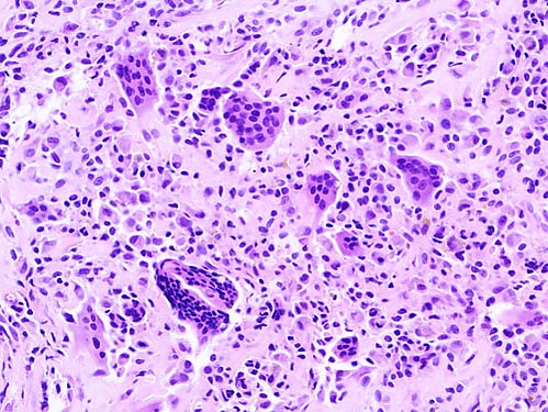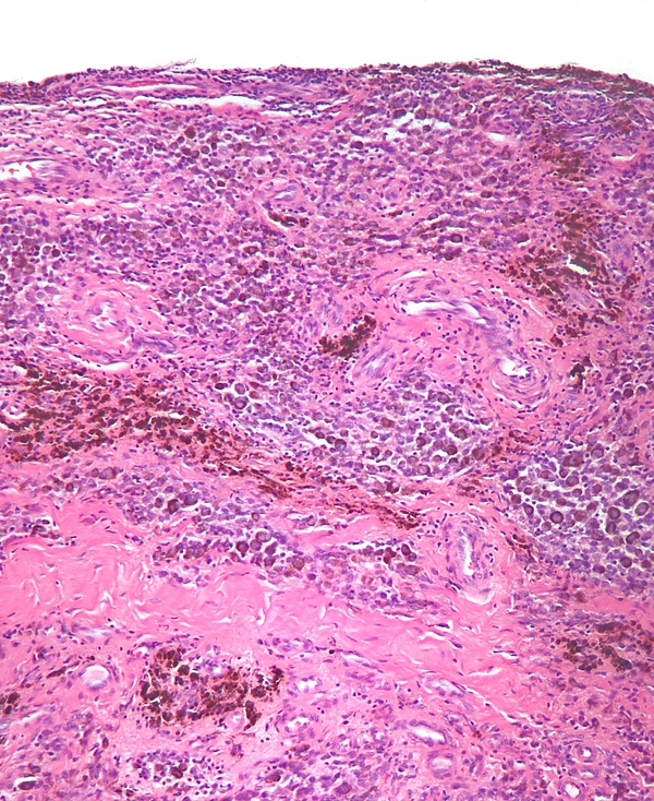 После удаления опухоли все патологические ткани направляются на морфологическое исследование. Микроскопическая картина опухоли характеризуется обилием гемосидерина, скоплениями гигантских многоядерных клеток и гиперплазией прилежащей синовиальной оболочки. Кроме того, в опухоли встречаются гистиоцитоподобные клетки, синовиальные фибробласты, лимфоциты и мелкие кровеносные сосуды разного калибра[3].