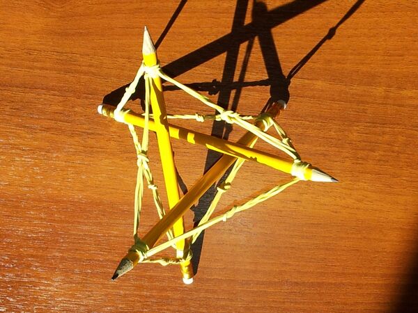 Тенсегрити — способность каркасных конструкций использовать взаимодействия работающих на сжатие цельных элементов с работающими на растяжение составными элементами для того, чтобы каждый элемент действовал с максимальной эффективностью и экономичностью. // Ричард Бакминстер Фуллер