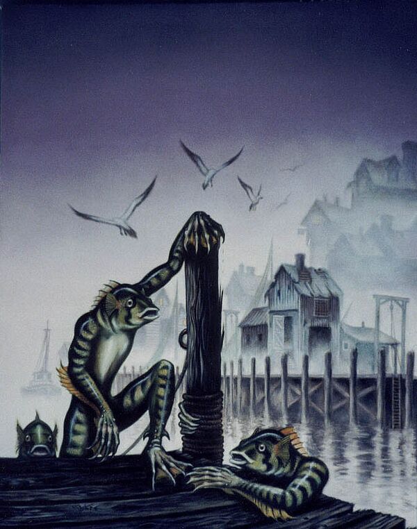 В первой половине XIX века, здешний капитан Абед Марш, во время одного из своих тихоокеанских плаваний, обнаружил некий остров, где жили Канаки, никогда не испытывавшие недостатка ни в рыбе, ни в золоте. Капитан покупал у них золото за бесценок и выведал секрет их процветания. Когда-то давно канаки с этого острова познакомились с Глубоководными — бессмертными разумными амфибиями, живущими в океане, на дне которого находятся их города. Эти рыболягушки поклонялись своим древним богам — Дагону и Гидре. В обмен на человеческие жертвоприношения и возможность породниться с людьми, Глубоководные пригоняли к берегам острова рыбу и приносили золото. Матросы взяли себе в жены женщин с этого племени, которые с возрастом начинали превращаться в таких же существ, рыболягушкек, и тогда они уходили в море, после чего уже никогда не старели. Вождь племени по имени Валакеа подарил Абеду некую свинцовую штуковину, с помощью которой можно было вызывать Глубоководных, если бросить её в море и прочесть особое заклинание. Но в 1838 году капитан Марш, в очередной раз приплыв на острова и обнаружил, что соседнее племя перебило всех жителей, а после этого золотой промысел закончился. В Иннсмуте же как раз перестала ловиться рыба и горожане стали бедствовать. Тогда Абед начал убеждать людей Иннсмута отречься от христианской веры и начать поклоняться Дагону. Он вызвал Глубоководных и заключил с ними сделку: те стали подгонять к городу рыбу и привозить золото, а взамен требовали человеческих жертвоприношений в Иннсмуте. С тех пор, в сетях иннсмутских рыбаков, рыба не переводилась никогда, даже если в соседних районах её не было вовсе. Абед заимел немало сторонников и в Иннсмуте, где стали часто пропадать люди. В 1846 году многим иннсмутцам это надоело и они схватили Марша и его сподвижников, посадив в местную тюрьму. Через две недели, ночью из моря вышли рыболягушки и убили большинство иннсмутцев (после эти смерти списали на эпидемию), освободив Марша. После этого, Абед стал главным в городе и основал «Тайный Орден Дагона», а оставшиеся горожане теперь обязаны были спариваться с рыболягушками. Ныне почти все иннсмутцы в родстве с Глубоководными, а семья Маршей по-прежнему заправляет городом. Но что хуже всего, рыболягушки что-то задумали и выращивают в приморских заброшенных домах города каких-то чудовищ — мерзких шогготов[7].