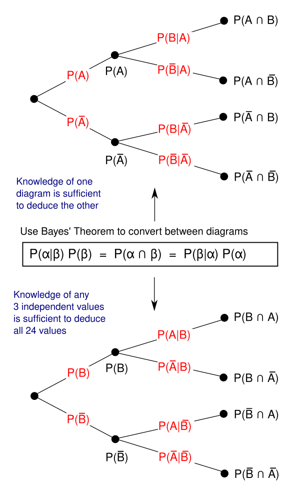 Роль теоремы Байеса лучше всего можно понять из древовидных диаграмм, представленных справа. Диаграммы демонстрируют различный порядок распределения событий по наличию или отсутствию результатов A и B. Теорема Байеса выступает как связующее звено этих распределений.