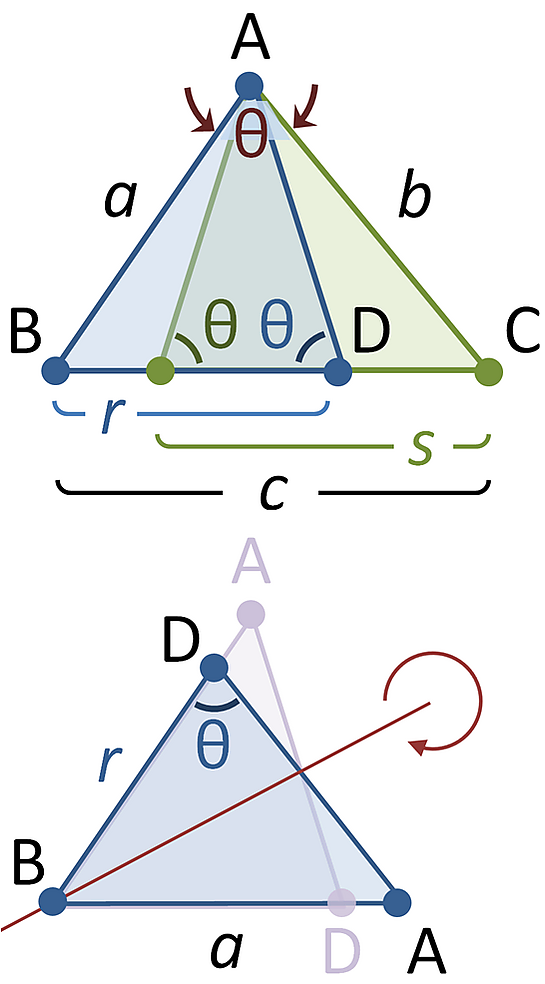 Существует обобщение теоремы Пифагора на произвольный треугольник, оперирующее исключительно соотношением длин сторон. Считается, что оно впервые было установлено сабийским астрономом Сабитом ибн Куррой[18]. В нём для произвольного треугольника со сторонами в него вписывается равнобедренный треугольник с основанием на стороне , вершиной, совпадающей с вершиной исходного треугольника, противолежащей стороне и углами при основании, равными углу , противолежащему стороне . В результате образуются два треугольника, подобных исходному: первый — со сторонами , дальней от неё боковой стороной вписанного равнобедренного треугольника, и — части стороны ; второй — симметрично к нему от стороны со стороной — соответствующей частью стороны . В результате оказывается выполнено соотношение[19][20]